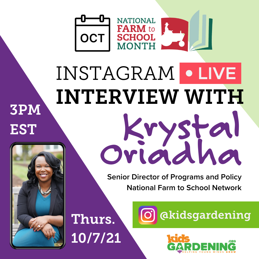 We will be talking about NFSN's Call to Action, youth gardening's role in racially just food systems, Farm to School Month, and more! Do you have any questions to ask Krystal? Please post them here! This thread will also serve as a space for continuing our conversation. Watch on Instagram by following @kidsgardening and joining our livestream or view the recorded interview on our IGTV.